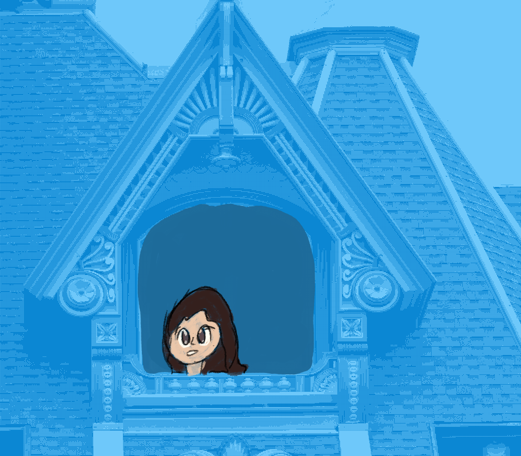 Sylvia looks through the window of the mansion room she has been residing in, and sees the vegetation that has just sprouted everywhere.